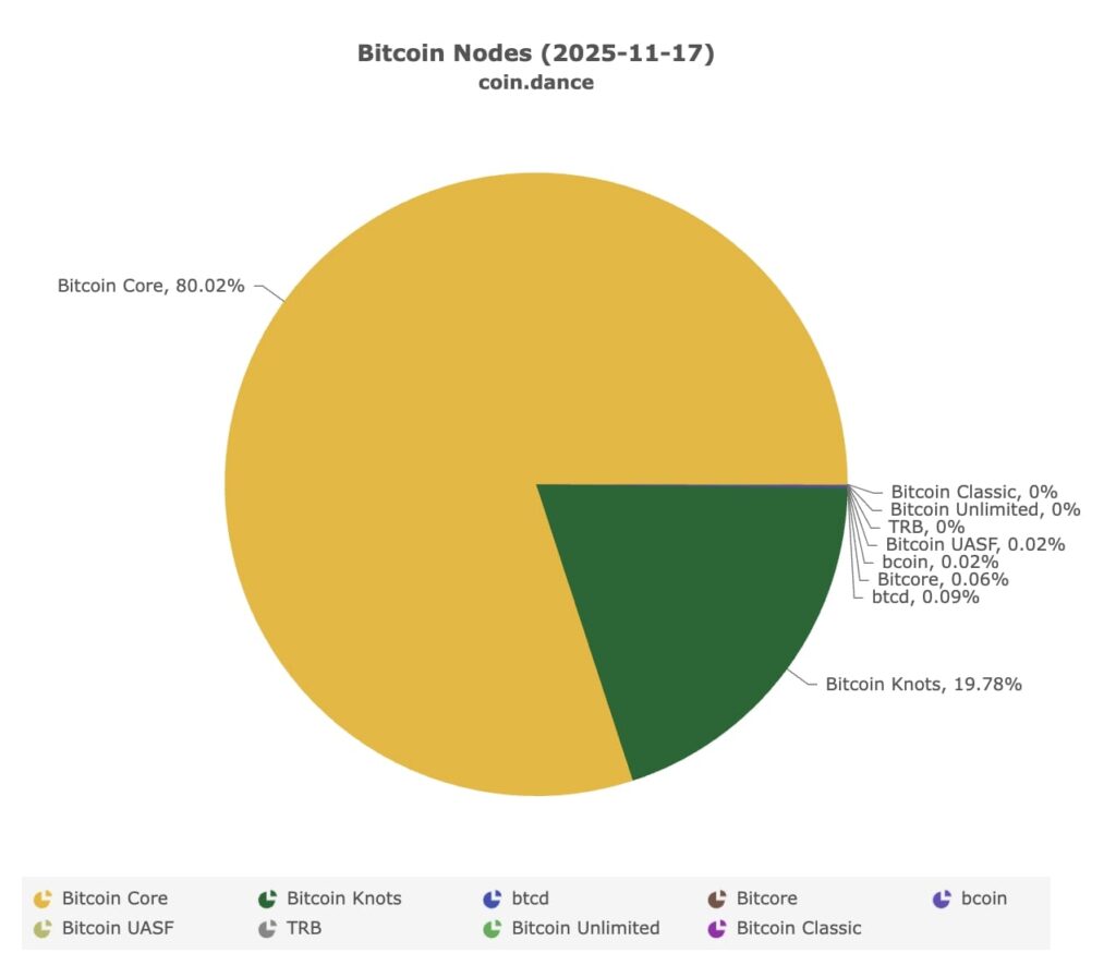 As of September 2025, approximately 20% of public Bitcoin nodes run Knots (4,600+ nodes), up from 69 nodes in January 2024 (638% growth). Bitcoin Core dominates with 80% of nodes. However, mining hash rate supporting Knots remains under 3%.