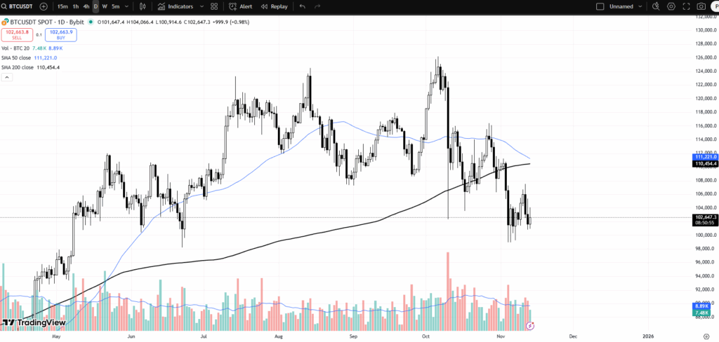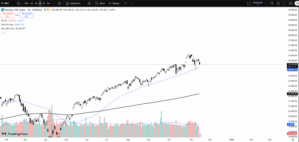 The US tech index started to fall after making a top on the daily timeframe on October 29, 2025. It bounced off the 50-day moving average, but that was just a temporary pump. Now it’s forming a consolidation pattern on the 1D chart, showing clear weakness in the markets—and everything looks ready to burst.