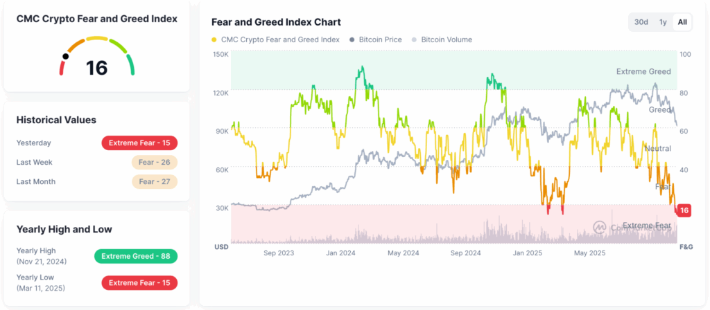 The Fear and Greed Index is sitting at 16 out of 100. That’s extreme fear territory. When I see numbers like that, I know we’re close to a bottom.