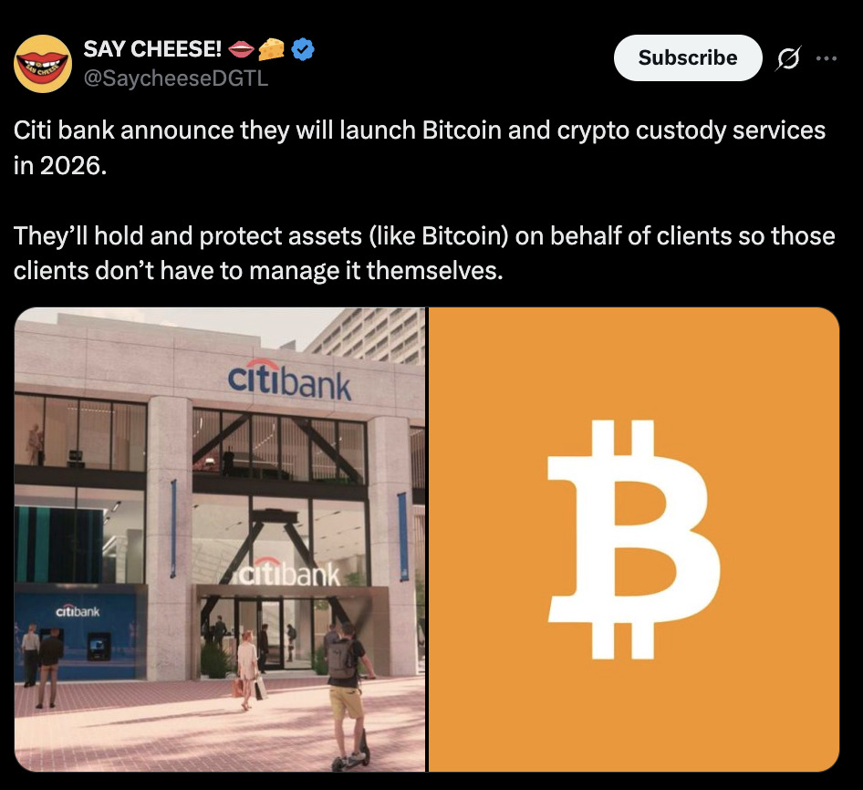 According to reports from CNBC and industry insiders, Citigroup has been quietly working on its crypto custody solution for over two years. The service is designed for asset managers, large corporates, and institutional investors who want exposure to crypto without dealing with the complexities of self-custody.