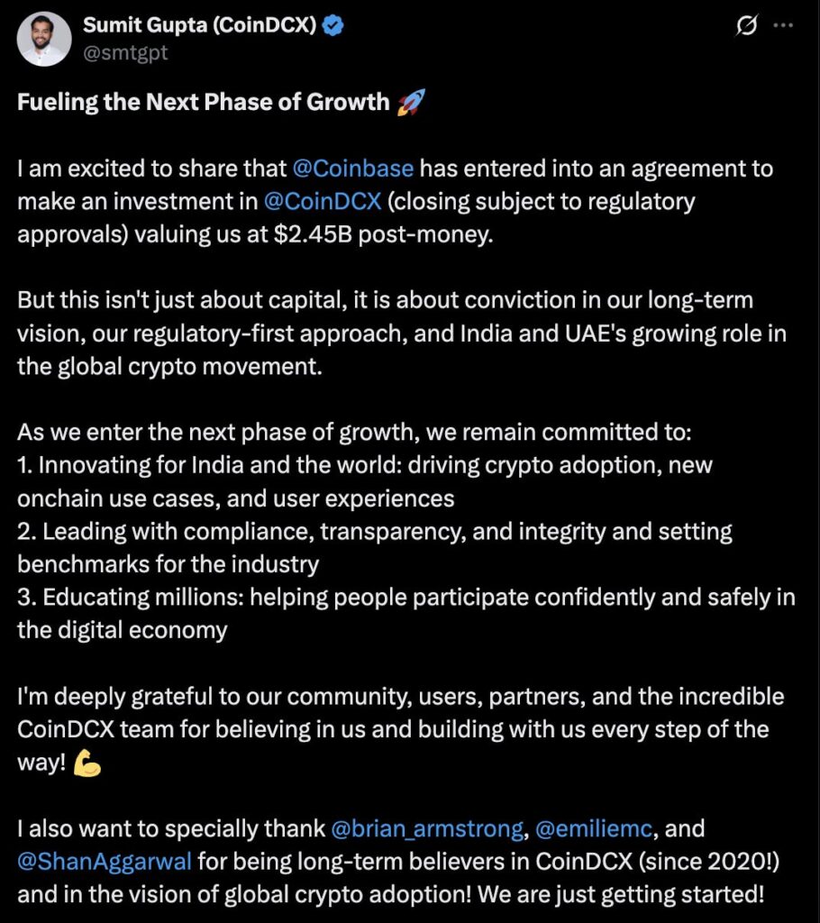 CoinDCX, headquartered in Mumbai, is one of India’s leading digital asset exchanges with over 20 million users and more than 500 cryptocurrencies listed. The company also recently expanded its reach into the Middle East and North Africa (MENA) region by acquiring BitOasis, a prominent regional player, making it an ideal partner for Coinbase’s strategic interests.