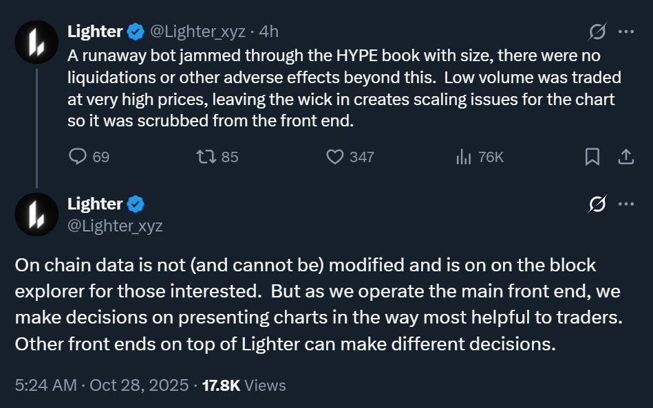 Lighter chose to remove the exaggerated price wick from its public charts to prevent scaling issues and protect traders from confusing data. According to the platform, on-chain records remain fully accessible and unaltered via block explorers for those keen on transparency, but the adjustment was a pragmatic decision for the user interface.