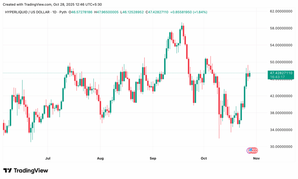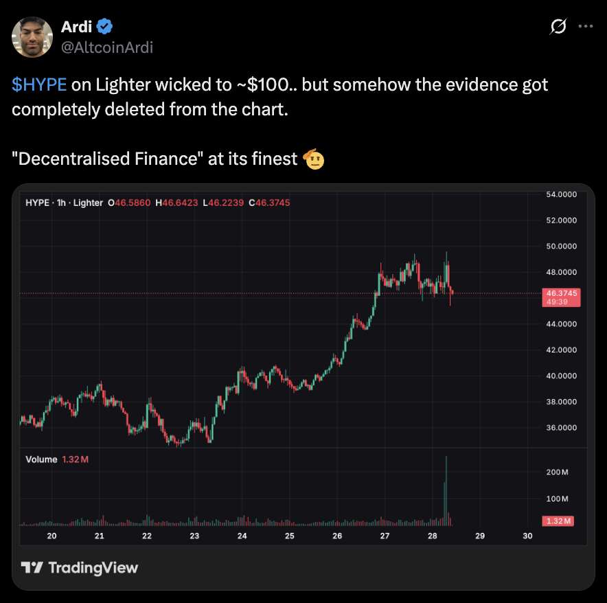 While no automatic liquidations occurred, traders reportedly panicked, with some closing positions prematurely to avoid risks, while others may have benefited unfairly from brief distortions. Following the incident, HYPE’s price stabilized around $47.8, with Lighter’s charts now showing a smooth price curve devoid of the notorious $98 spike.