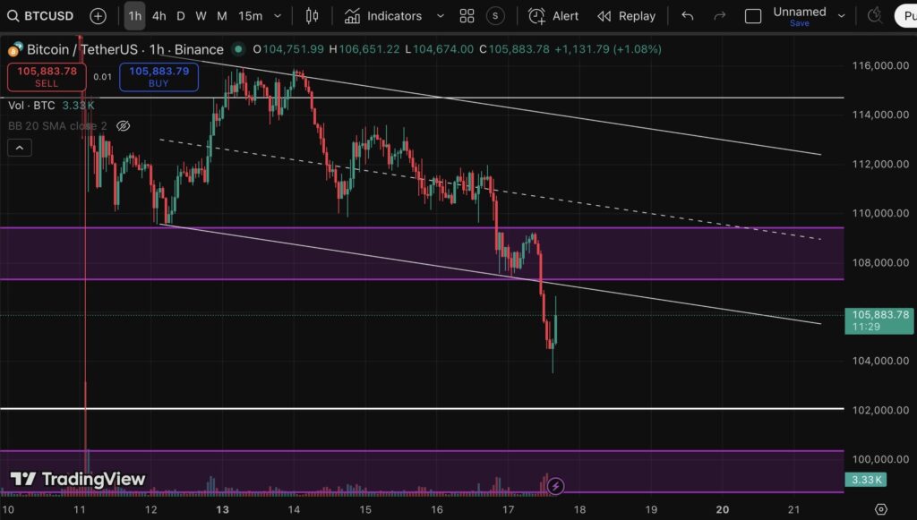 As of writing, Bitcoin (BTC) is trading around $105,900, with our analysts identifying a local bottom near $103,500. Despite the prevailing bearish sentiment, a short-term rebound toward $109,000 appears likely in the coming days. With the weekend approaching and overall market sentiment leaning negative, a wave of short-covering could trigger a brief relief rally before any renewed downside pressure.