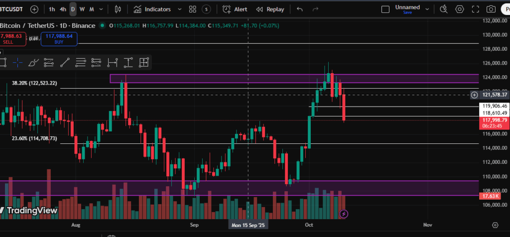 - Critical Support Breach – The break of 118,600 highlights that buyers are losing control.