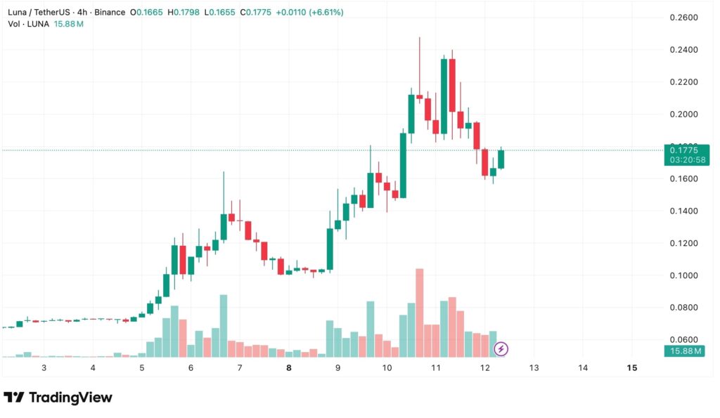 Terra LUNA token jumped 116% over seven days, catching plenty of traders by surprise. The rally peaked around $0.24 before pulling back to trade near $0.17 by December 12, but weekly gains still look impressive compared to where the token sat just a week ago.