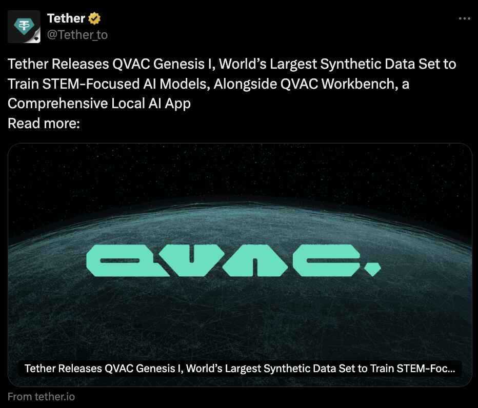 Tether isn’t stopping at digital finance. The launch of QVAC Genesis I reflects the company’s ongoing shift into advanced computing and machine learning. According to Tether Data, which led the project, the new dataset merges AI and blockchain technologies to support more accurate and logical machine learning capabilities.