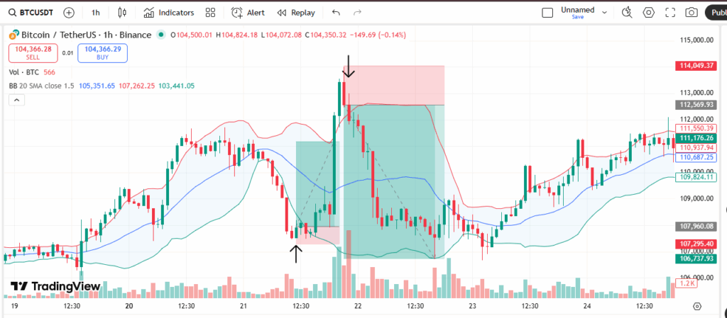 - Apply Bollinger Bands with 20-period moving average and 1.5 standard deviation