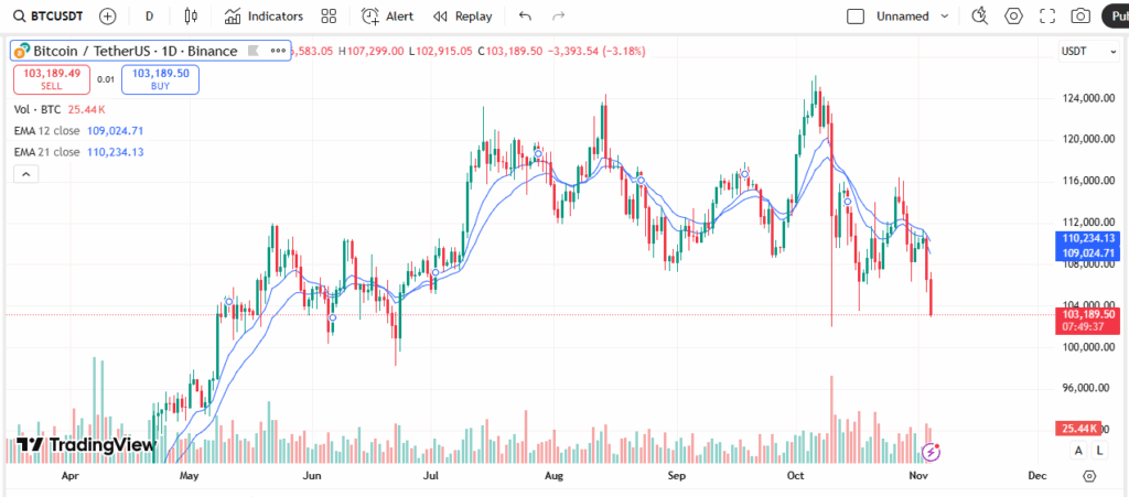 How It Works: This strategy uses two EMAs: a faster 12-period EMA and a slower 21-period EMA. When the faster EMA crosses above the slower one, it signals bullish momentum. When it crosses below, it indicates bearish momentum.