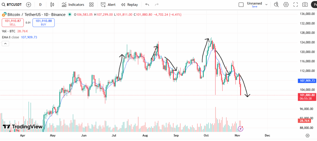 Why It Works: This multi-timeframe approach aligns your trades with the dominant trend while providing low-risk entry points. The 8 EMA is fast enough to stay close to price during trends but smooth enough to avoid false signals.