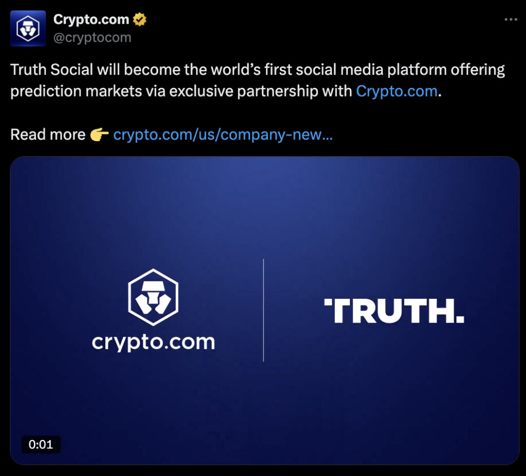 TMTG said it will integrate its own reward system from Truth Social and Truth+ platforms. Users earn “Truth gems” for engagement which can be converted into CRO tokens to buy prediction contracts through the new offering.
