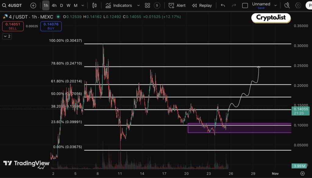 This rapid CEX adoption is rare for new meme tokens and significantly boosted $4’s visibility and accessibility to mainstream traders.