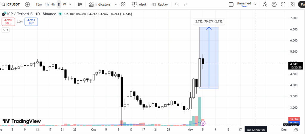 Internet Computer (ICP) has emerged as one of the strongest performers in the crypto market this week, catching the attention of traders worldwide. After hitting an all-time low of $1.98 on October 10, 2025, the token has staged a remarkable comeback, surging over 152% to trade around $5.00. Let’s break down what’s driving this explosive rally and examine the data behind the pump.