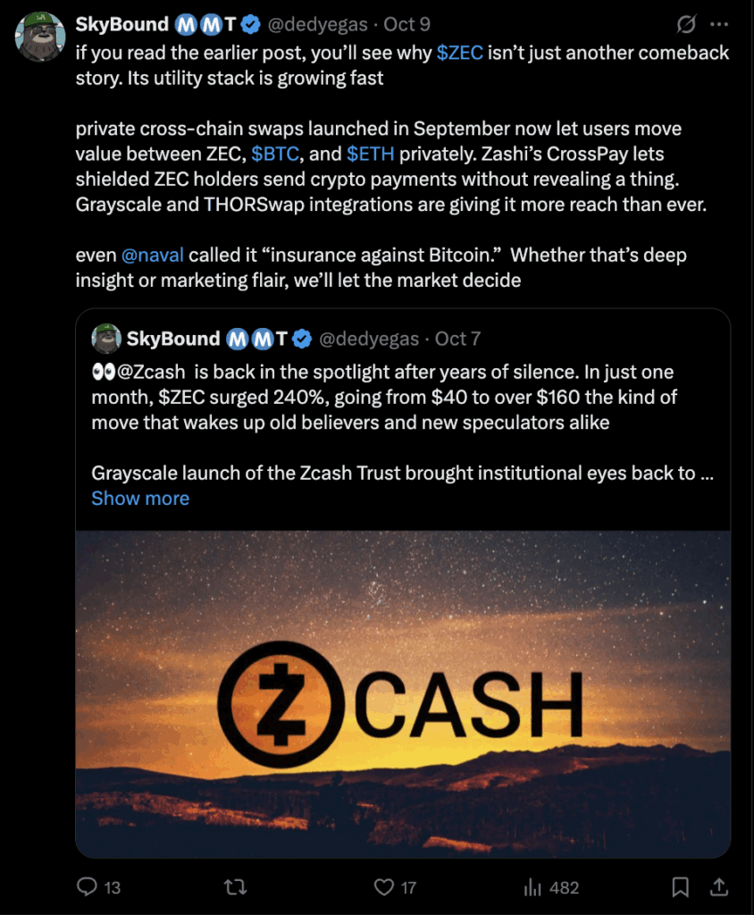 The recent surge in ZEC price is not just hype or a random pump. According to crypto analyst SkyBound (@dedyegas), this rally reflects real utility and development momentum. SkyBound highlighted that ZCash now supports private cross-chain swaps launched in September 2025. These swaps enable users to privately transfer value between ZEC, Bitcoin (BTC), and Ethereum (ETH), a feature that was previously difficult to achieve with privacy: